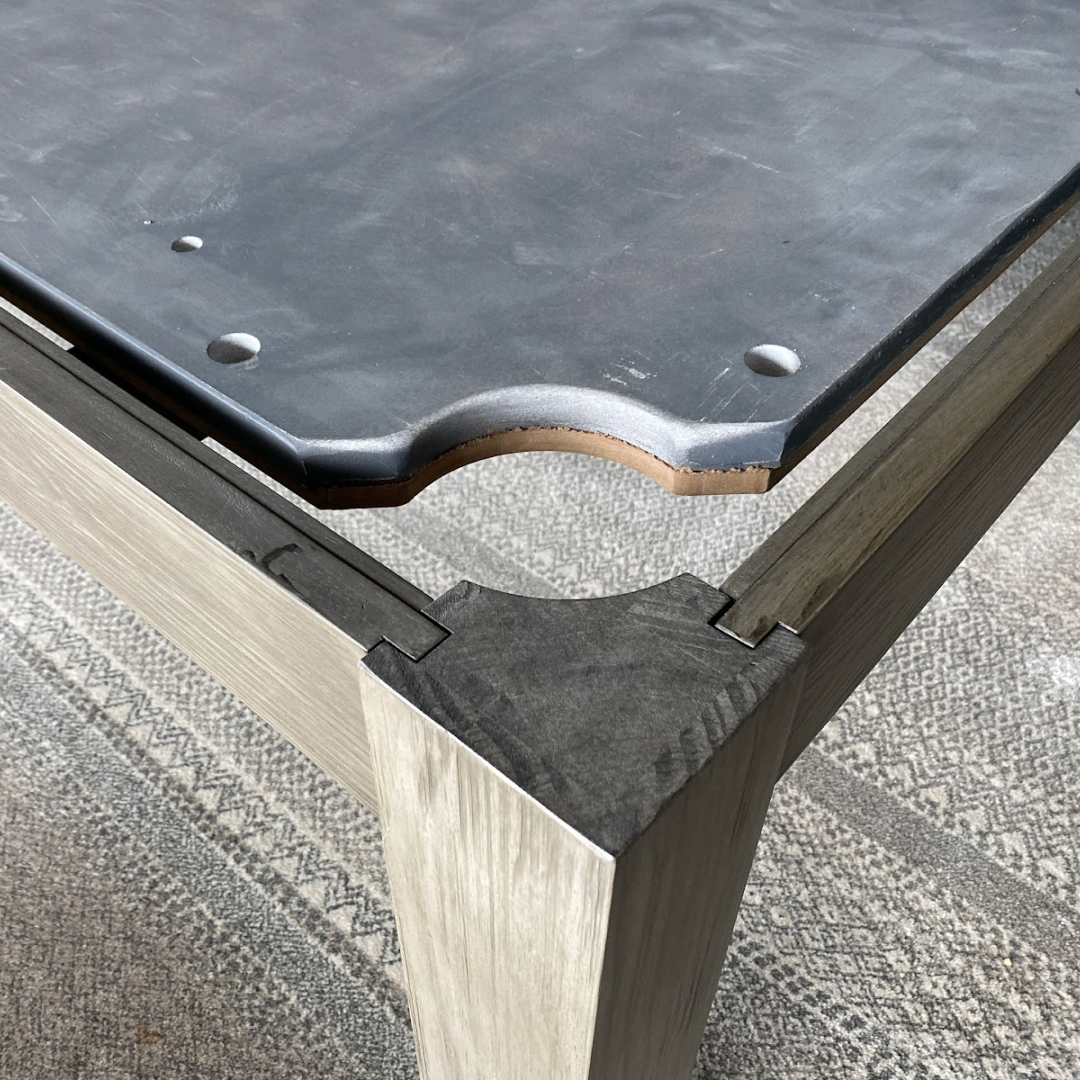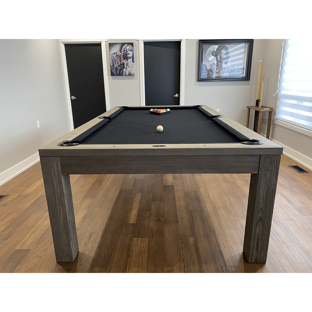 Majestic Mensa in Barnwood Grey finish 8-foot pool table made from solid North American and European real Oak wood, topped with a professional quality laser-precision cut one-inch thick natural quarried slate play surface, genuine leather pockets and 25-year warranty.