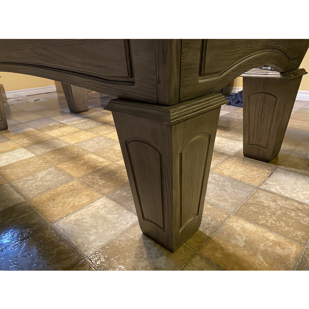 Crafted from the finest North American and European solid woods, the Majestic Pioneer showcases a weathered appearance, evoking the allure of aged craftsmanship. The table is built to last, featuring sturdy construction, natural quarried one-inch slate for exceptional playability, and genuine leather pockets that add a touch of luxury.