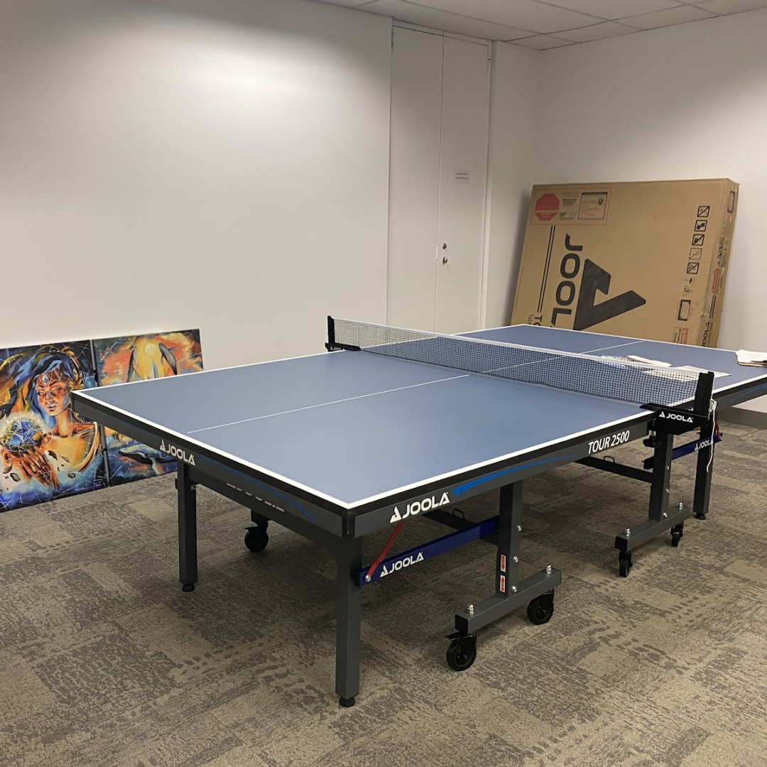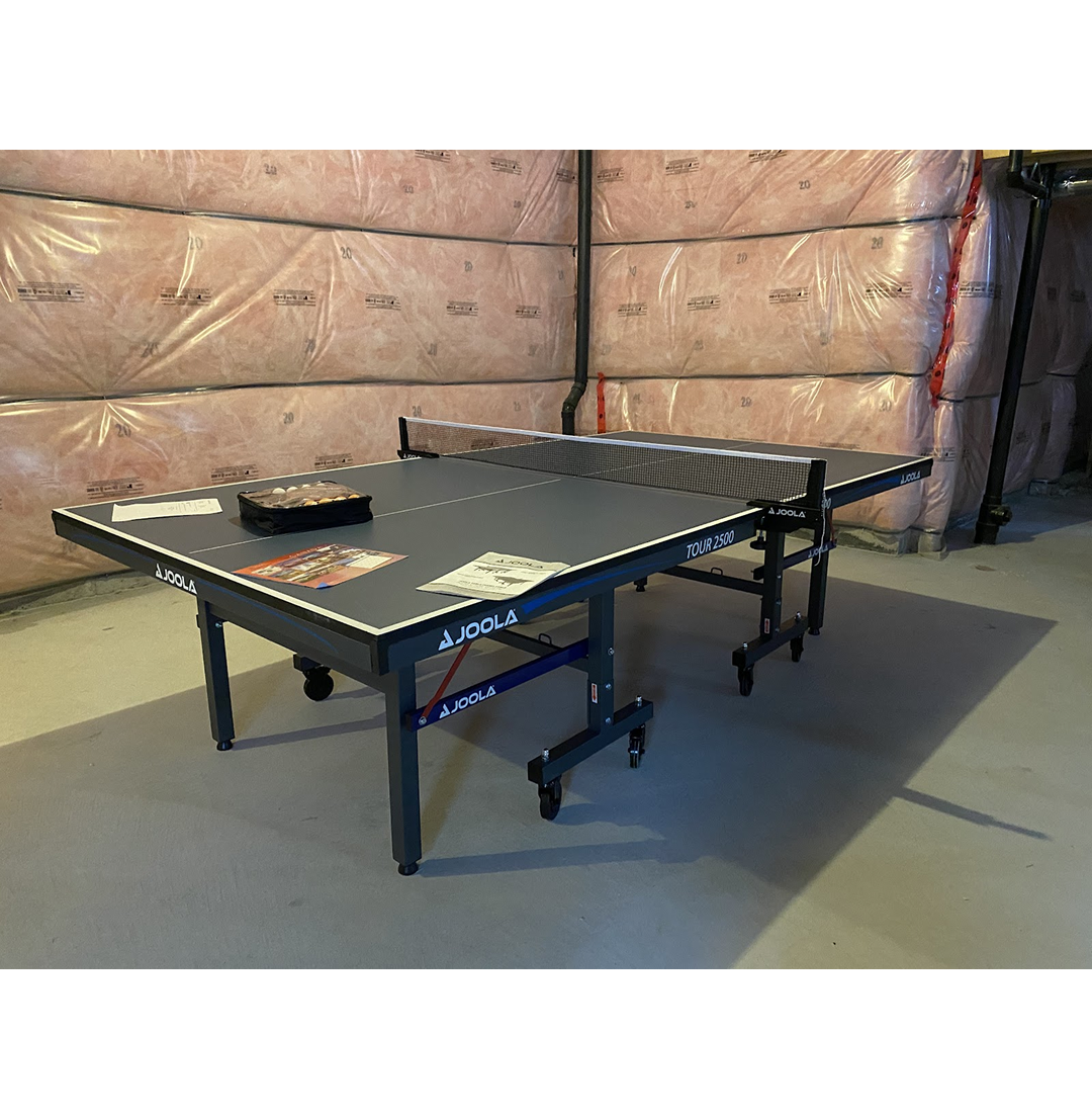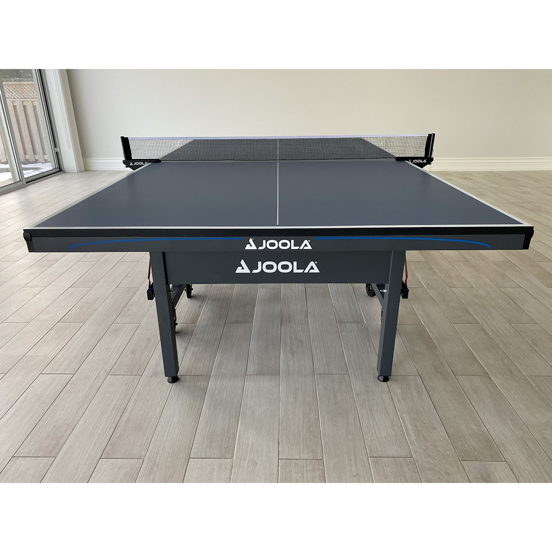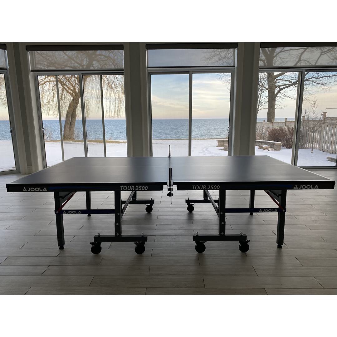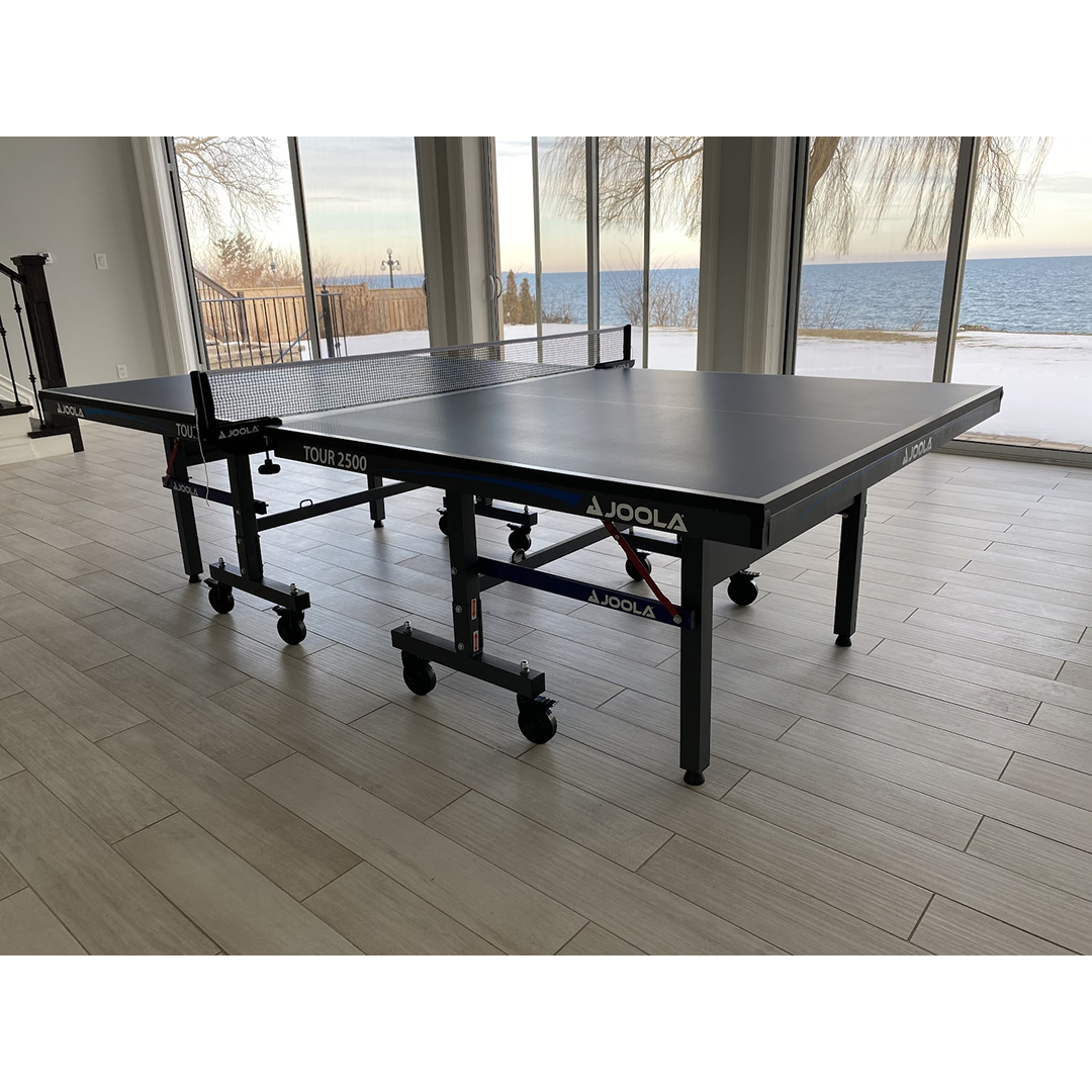 The new Tour 2500 table is designed for professional training and elite competition, perfect for players lookingto keep their skills up to par. This table comes complete with a net and featuresan 25mm painted table surface with a 50mm Black powder-coated metal undercarriage. Each table half has automatic folding legs and four locking casters, along with 3 inch wheels for easy roll-away storage. It also comes loaded with a double anti-tilting device for increased safety and leg levelers.